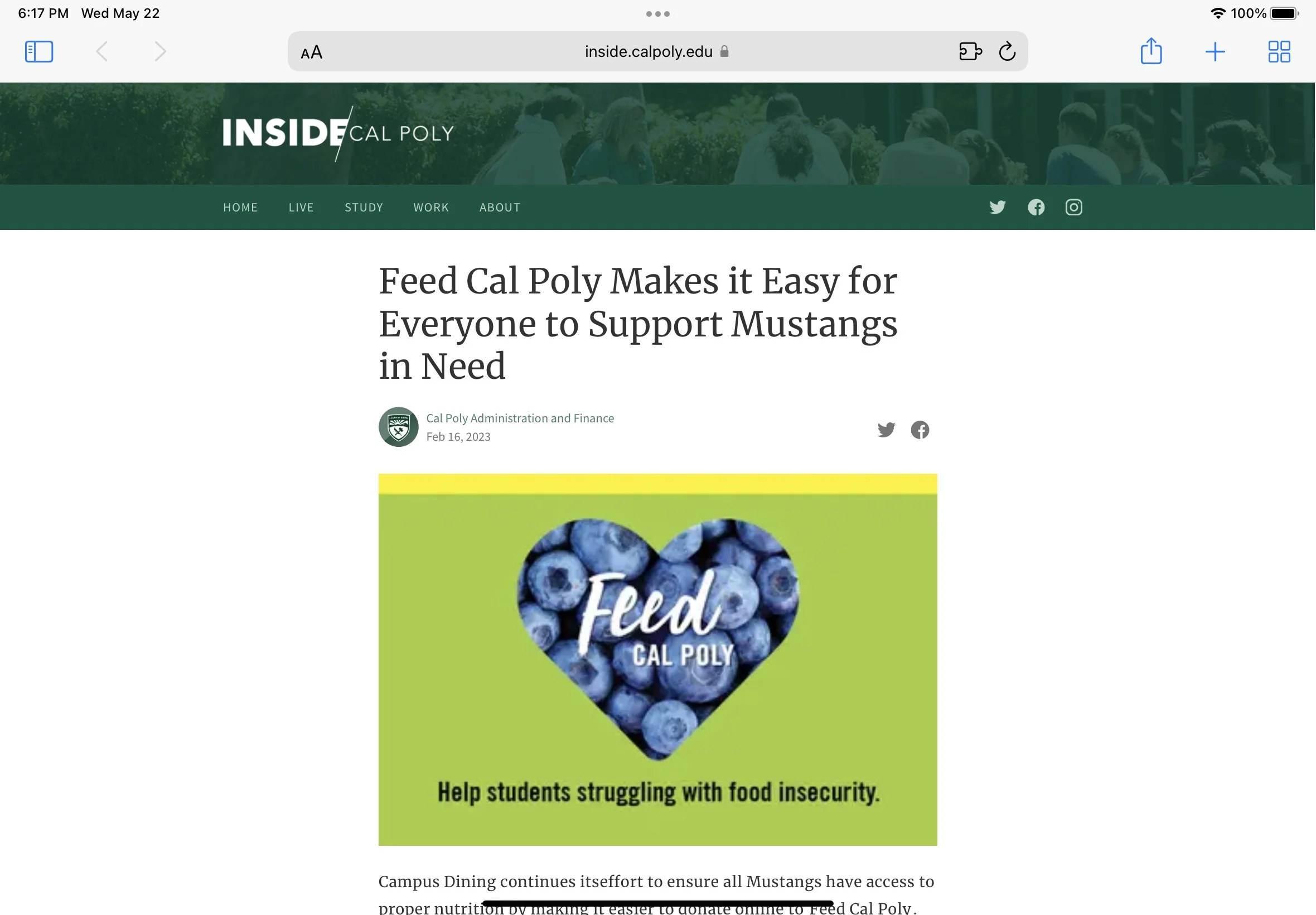 Click here to read an article I wrote for the Inside Cal Poly blog, promoting the Feed Cal Poly program which helps students affected by food insecurity.